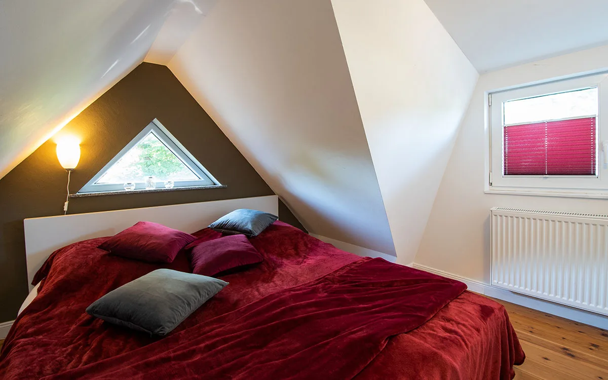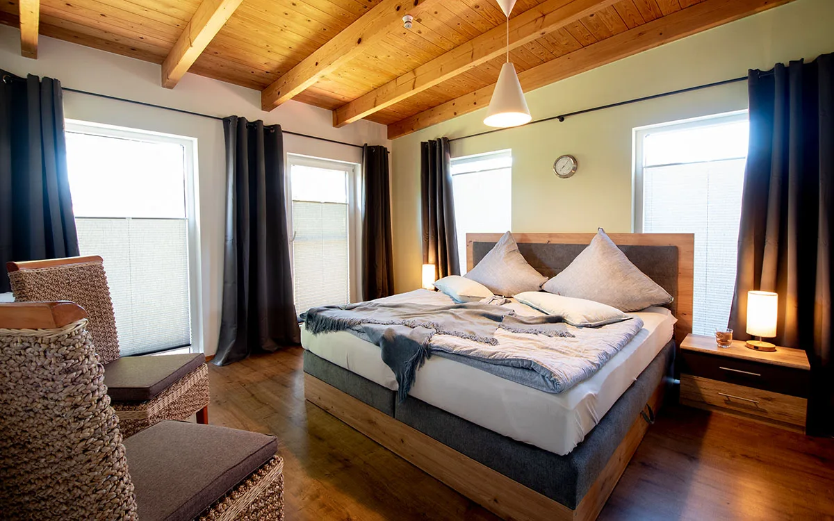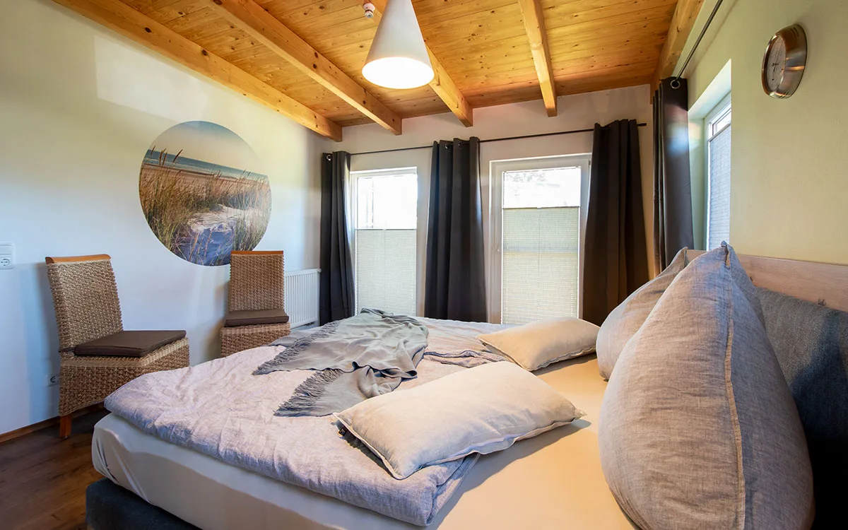 Unser Ferienhaus GROßER KATER präsentiert sich als perfektes Quartier für den Urlaub mit Haustieren. Auf geräumigen 95 Quadratmetern und über zwei Etagen verteilen sich drei Schlafzimmer, ein modernes Bad und der offene Küchen- und Essbereich, der nahtlos in das Wohnzimmer übergeht. Im Hauptschlafzimmer befindet sich ein Boxspringbett (Laken 180 x 200 cm). Zwei weitere Schlafzimmer mit jeweils einem Doppelbett schmiegen sich charmant unter das Dach. Hochwertige Matratzen sorgen dafür, dass Sie auch hier gut schlafen werden. Das Bad ist mit einer ebenerdigen Regen-Luxusdusche ausgestattet.